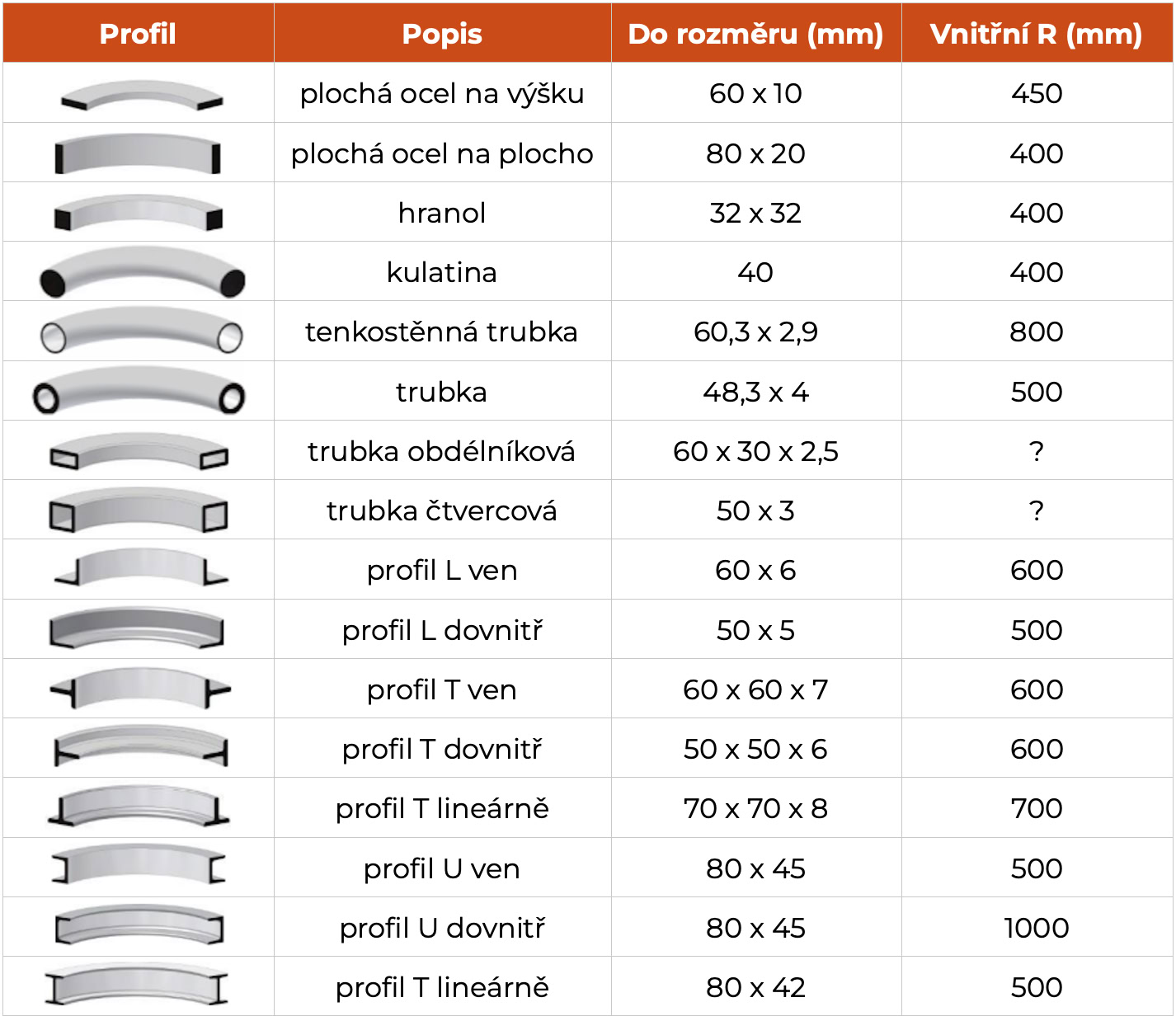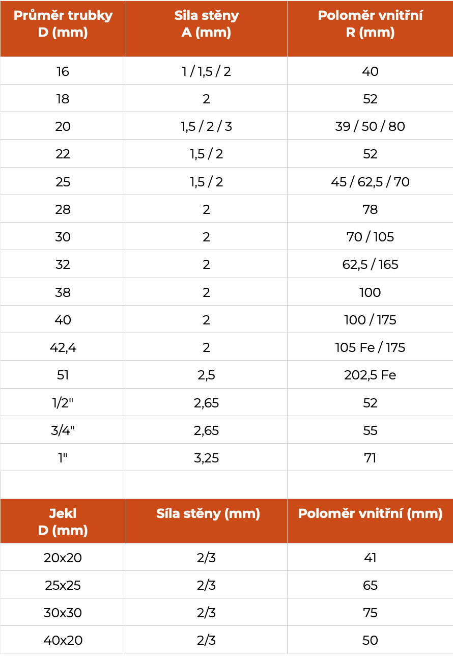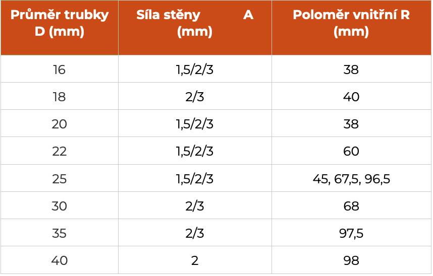 Minimální a maximální průměry trubek závisí na ohybovém rádiusu, tloušťce stěny ohýbané trubky a na vlastnostech materiálu. K ohýbání požíváme NC a CNC stroje. Viz tabulka níže.